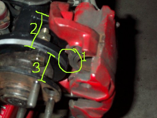 I have made the needed modifications to the stock caliper brackets, and mounted them to the spindles. This involed about 45 minutes with a grinder and then painting them (red of course, anything red stops faster). I welded the provided bolt to the spare rear bearings that I had. I reused the old bracket mounting bolts and got six (three for each side) new 2"x1/2" grade 8 bolts to hold the spare rear bearings to the spindle.