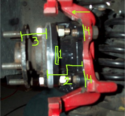 In retrospect I would have bought the bearings from HMS. Even thought they were easy to weld together, and I saved $80, I caused my self problems by using used bearings. Because I used old bearings the distance 3 in the pictures below was different on the two bearings. This caused me to have to machine about 1/16 off the brake bracket where the 4s are in the below pictures.